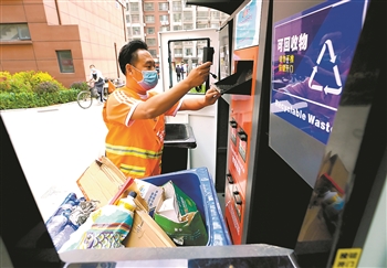 6月7日,环卫工人在河北省唐山市路北区学院雅居小区清理回收智能垃圾分类柜中的垃圾。智能垃圾分类柜对居民投放的垃圾自动进行称重,居民通过扫描二维码或人脸识别就可以得到环保积分用于兑换日用商品。 新华社记者 杨世尧 摄