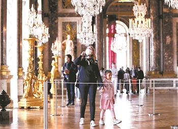 6月6日,游客在法国巴黎近郊凡尔赛宫的镜厅内参观游览。受新冠疫情影响关闭了82天的法国著名景点凡尔赛宫于6日重新开门迎客。新华社记者 高静 摄