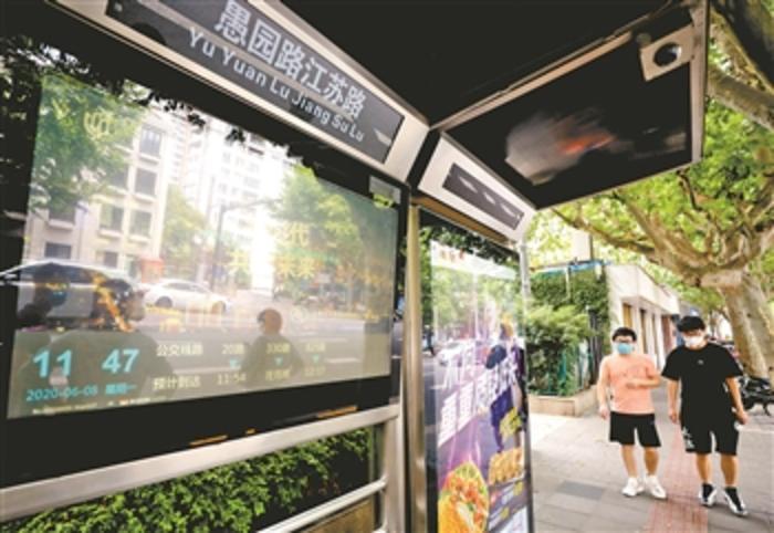 图为上海愚园路边一座智能公交车站,屏幕上可以实时显示车辆到达时间,方便乘车市民查询(6月8日摄)。
