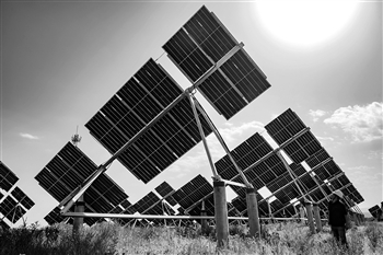 右图:6月3日,在位于陕西铜川宜君县云梦乡刘家埝村马塬组峡光250兆瓦光伏发电项目1号基地试验区里,运维人员检查隆基绿能斜单轴支架跟踪式光伏发电系统运行状况。相比固定支架,同等装机容量的电站,斜单轴支架电站发电量可增加18%。 本报通讯员 袁景智 摄