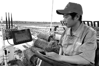 上图:6月6日,安徽铜陵市首台北斗高精度自动驾驶插秧机正式投入农业生产。北斗高精度自动驾驶插秧机是利用北斗定位系统和物联网技术,对传统插秧机进行智能升级改造而成。过仕宁 摄/中新社