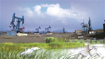 我国最大的内陆淡水湖博斯腾湖是新疆巴音郭楞蒙古自治州唯一的水源地,“白鹭号”计量站距离这条湖只有约300米。该站注重清洁生产,把绿色企业创建行动落到实处。图为6月4日,这里油井忙碌运转,白鹭自在栖息。 乔庆芳 张秉宇 摄