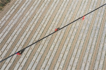 图为工人在棉花地里支起架子,用钢绳牵引管道穿过棉田。刘亚雄 摄