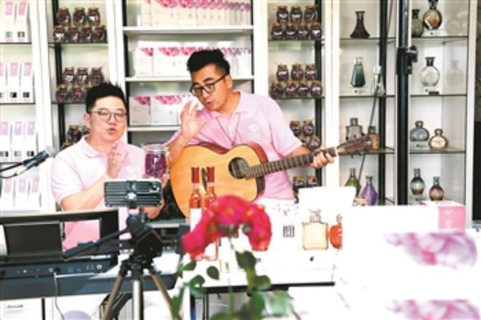 图为6月9日,在埭溪镇四季玫瑰庄园,一个直播团队在售卖玫瑰主题的化妆品。