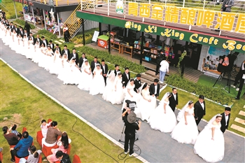 6月9日,一场以“幸福不延迟,爱在西海岸”为主题的集体婚礼在青岛西海岸新区金沙滩啤酒城举行,27对新人在大海的见证下喜结连理。