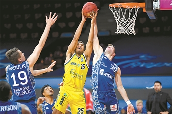 6月7日,柏林欧绿保队球员肯内特(中)和法兰克福队球员拉翁(右)在比赛中拼抢。当日,在慕尼黑举行的德国篮球职业联赛中,柏林欧绿保队以81比72战胜法兰克福队。