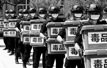 6月3日,在山东烟台开发区一家危废处理企业,特警在搬运需要销毁的毒品。当日,烟台警方将全市近年来收缴的140余公斤毒品进行了集中销毁。为减少对环境的污染,此次毒品销毁采用了无害化处理方式。