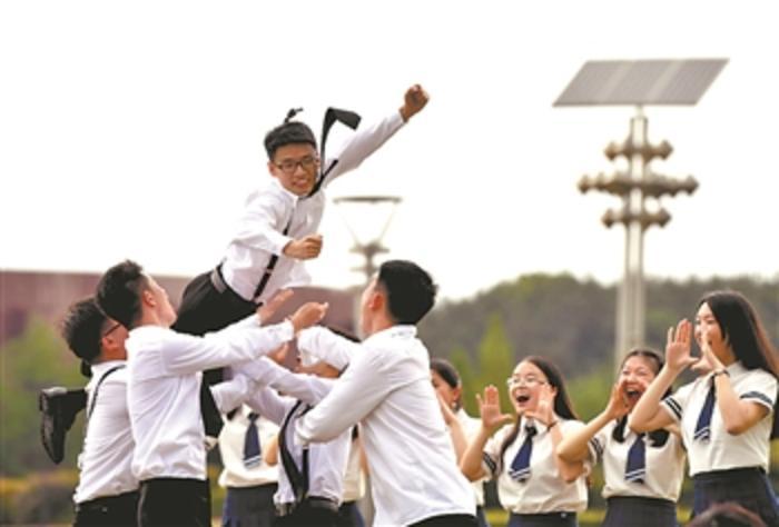在南昌大学校园内,学子们一起欢呼,拍毕业照留念(6月10日摄)。