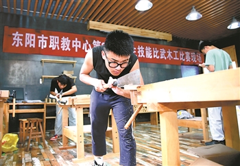 6月10日,选手们正在进行木工大比武。当日,浙江省东阳市职业教育中心学校东技校区举办第23届技能比武暨展示活动。