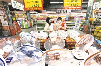 6月10日,在宿迁市宿城区屠园乡古河社区内的超市,店员王成平(右)给顾客介绍商品。31岁的王成平2014年搬迁到社区居住,已在该超市工作3年多,实现家门口就业。