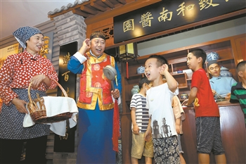 6月11日晚,“京城叫卖大王传人”臧泉江的吆喝声在北京王致和科普腐乳馆响起,一位小朋友也学着吆喝起来。当日,为迎接国家第十五个文化和自然遗产日,在王致和腐乳科普馆中,“云逛馆”直播卖货活动开启,小朋友们在现场体验古法制作腐乳。据悉,6月10日,北京市商务局发布《北京市促进新消费引领品质新生活行动方案》,其中强调北京市将推动实体商业直播卖货等新模式,加速培育壮大“互联网+”消费新模式。 本报记者 刘金梦 摄