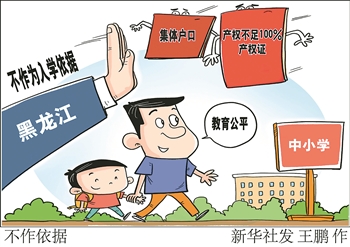 黑龙江省教育厅、黑龙江省公安厅、黑龙江省自然资源厅日前联合印发《黑龙江省中小学校“四零承诺”实施细则(修订)》,明确集体户口、产权不足100%产权证不作为中小学招生入学依据,以进一步确保招生规范,推进教育公平。 新华社发 王鹏 作