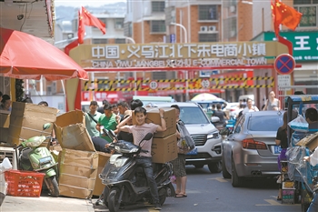 6月7日,在义乌江北下朱电商小镇内,拉货的车辆排成长队,现场一片忙碌景象。