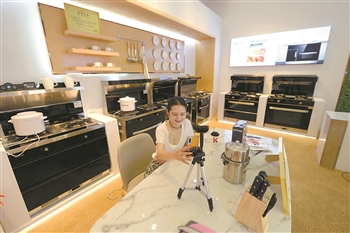 6月8日,义乌欧意电器厨房展厅里,主播王彤彤正在直播卖货。