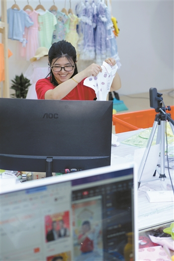 6月7日,义乌弘尚股份直播间里,主播陈熠璟正在一家电商平台上做童装直播。