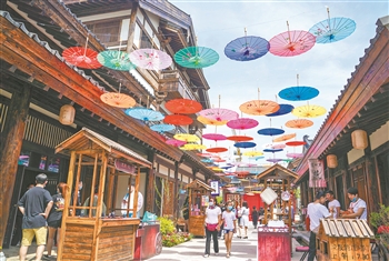 图为6月13日,市民在长春市世茂莲花山小镇宽厚里商街参观游览。