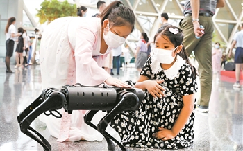 6月12日,一场以“致敬生命守护人”为主题的夜间专场公益活动在上海科技馆举行。活动邀请一线医务工作者及其家属参与,让他们享受妙趣横生的博物馆奇妙夜。图为小朋友在活动中参观四足机器人。 新华社记者 方喆 摄
