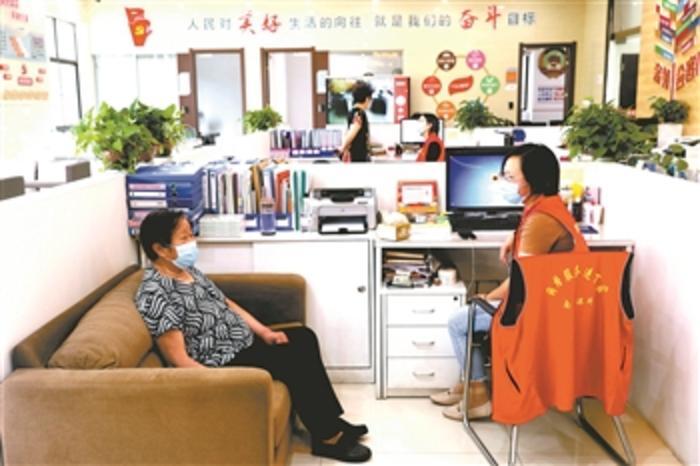 6月14日,江苏省南通市唐闸镇街道高店社区服务中心,工作人员正在接待一名市民。工作人员统一坐办公椅,来访群众则安排了沙发座。