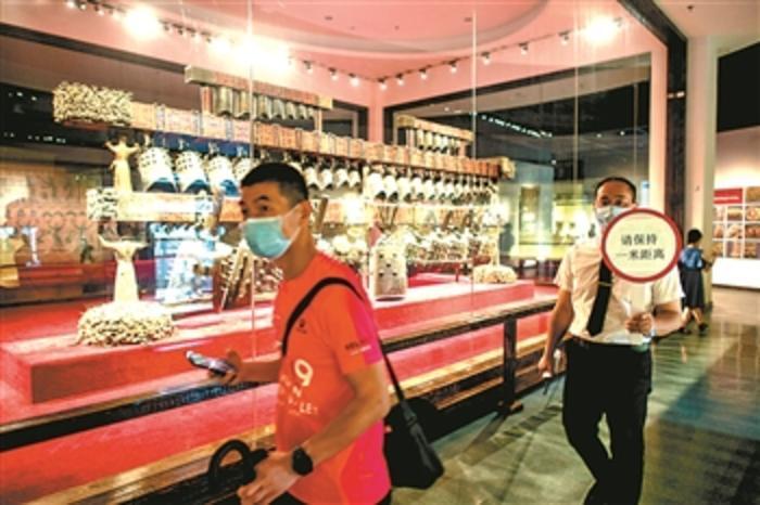 6月14日,湖北省博物馆的工作人员提示参观者保持安全距离。