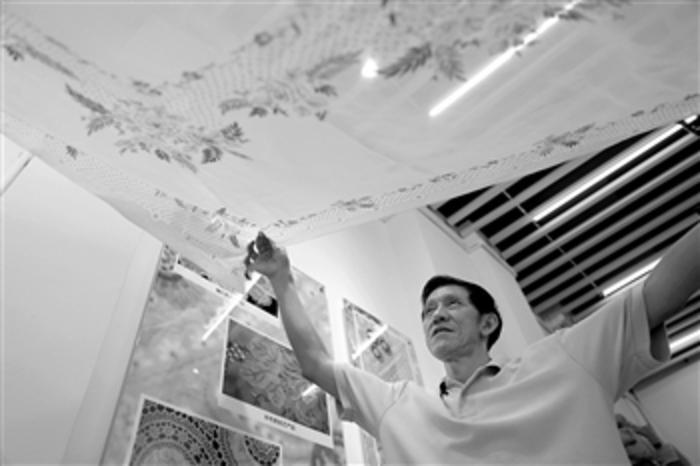 6月3日国家级非遗项目抽纱传承人陈树泽在检查抽纱作品。