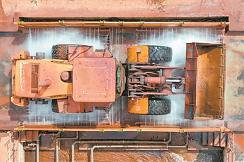 图为一辆工程车在自动感应式洗车场内洗车。蒋晓东 摄