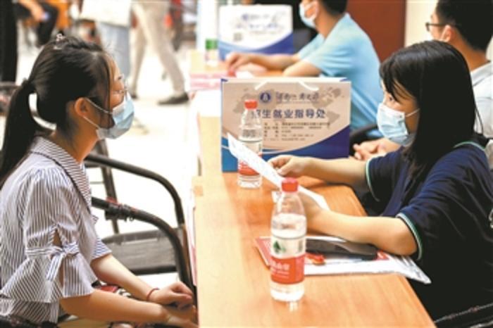 6月17日,在湖南工商大学专场招聘会上,求职者(左)在接受用人单位的面试。