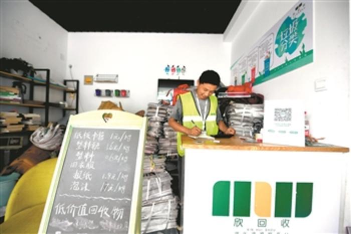 6月17日,在位于湖州市龙泉街道华丰社区华丰一区的废品回收连锁服务站,工作人员韩飞在记录当天回收的各类废品数量。