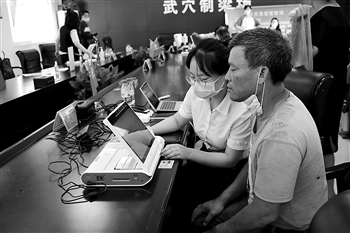 6月15日,黄(冈)黄(梅)铁路3标段,湖南籍农民工周师傅正在拍照,现场办理个人银行卡。