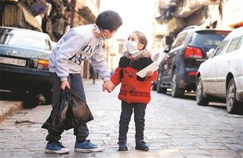 在叙利亚大马士革,两名佩戴口罩的儿童走在街头。新华社发(阿马尔 摄)