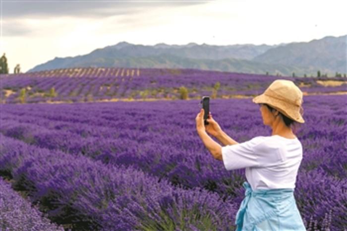 6月16日,游客在新疆伊犁河谷霍城县芦草沟镇四宫村的一处薰衣草花田里拍照留念。