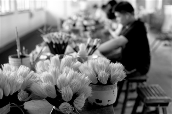 6月17日,湖州市善琏湖笔厂的技师在择笔车间作业。