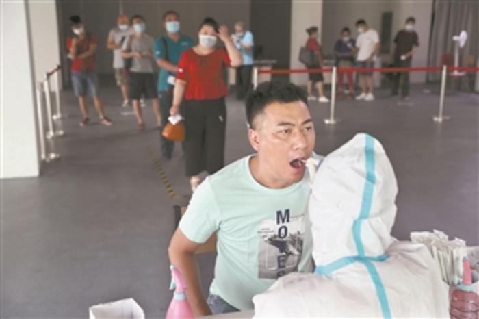 北京市加强市民核酸检测,6月19日,北京爱普益医学检验中心,工作人员正在提取咽拭子。本报记者 王伟伟 摄
