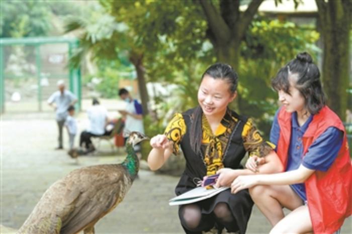 6月18日,在重庆市动物园,志愿者徐小娇(右一)陪着聋哑女孩萍萍(左一)观赏孔雀。