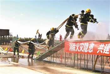 6月20日,位于南疆塔克拉玛干沙漠北缘的西北油田举办了一场应急技能比武。本此比武共有12个代表队72名选手参加初期火灾处置、一人三盘水带连接、应急救援、4×50米佩戴空气呼吸器接力跑比赛和消防理论考试5个项目的“大比拼”。 本报记者 孙喜保 摄