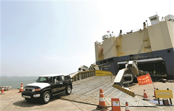 6月21日,司机在天津港环球滚装码头接卸车辆。