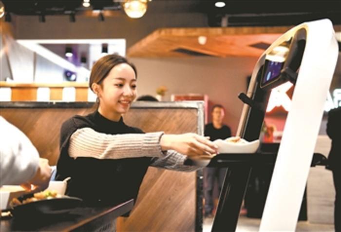 在中新天津生态城“X未来餐厅”,顾客通过自动驾驶机器人取菜。