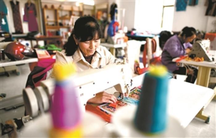 图为6月23日,在青海省共和县廿地乡廿地村藏族服饰加工产业扶贫车间内,工人史菊兰在缝制服饰。 2018年起,青海省海南藏族自治州共和县通过设立扶贫车间,带动当地农民就近就业。目前,共和县拥有8家扶贫车间,从业人员超过400人。扶贫车间成为当地农民就近就业的希望车间。