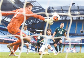 6月22日,曼城队球员大卫·席尔瓦(右二)在比赛中射门得分。当日,在2019-2020赛季英格兰足球超级联赛第30轮比赛中,曼城队主场以5比0战胜伯恩利队。新华社/路透
