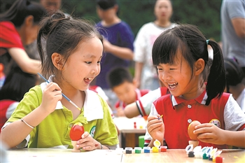 6月24日,南昌市湾里区站前街道文明北路社区的孩子们在画彩蛋。