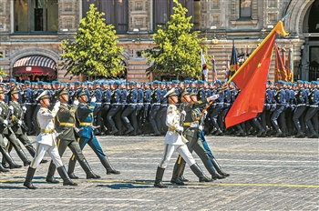 6月24日,中国人民解放军仪仗方队参加在俄罗斯莫斯科红场举行的纪念卫国战争胜利75周年阅兵式。 新华社发 (叶甫盖尼·西尼岑 摄)
