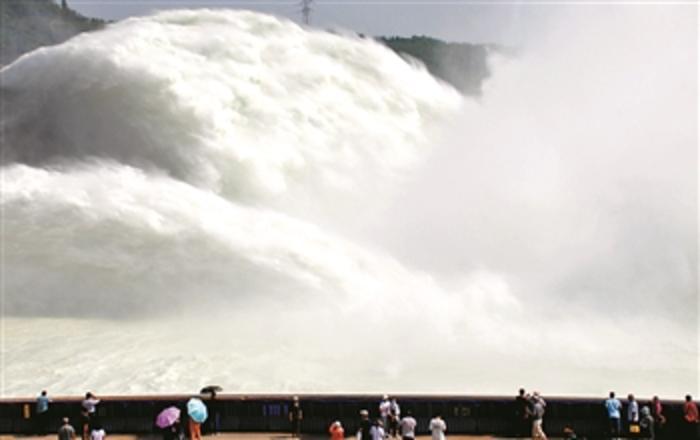 6月25日,游客在观看黄河小浪底水库泄洪。