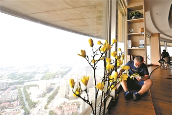 6月25日,一名男士在天津市河西区天塔西岸书斋·知道吧内阅读书籍。该“高空书吧”是一个能欣赏津城全景的休闲阅读空间。书吧距离地面257米,面积约600平方米,有藏书近万册,涵盖文学、历史、儿童绘本等22个种类。 新华社记者 李然 摄