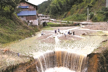 6月25日,群众在贵州省榕江县仁里水族乡通倒村受灾农田里清理杂物。