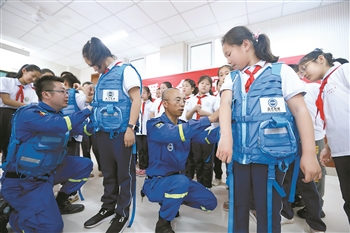 6月23日,山东青岛市即墨区蓝天救援队的志愿者为华山路小学学生讲解救生衣使用方法。