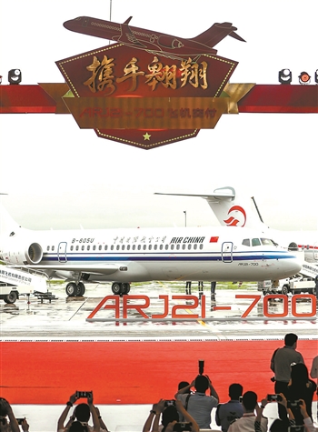当日,三架崭新涂装的国产新支线客机ARJ21飞机在位于上海浦东的中国商用飞机有限责任公司总装基地集结,分别交付给国航、东航、南航三大航空公司,标志着ARJ21进入我国主流民航市场。