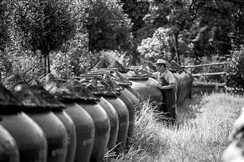 6月26日,工人在查看醋的晾晒情况。