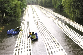6月29日,工作人员在吴兴区湖东街道的“水上稻田”插秧。今年以来,浙江湖州吴兴区湖东街道开始在辖区河道大规模推广“水上稻田”新型农业项目,利用浮岛进行特种水稻种植,既能净化水体,又能产出生态稻谷。新华社记者 翁忻旸 摄