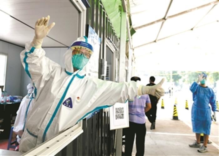 宋亚静在北京市通州区梨园镇公庄小区附近的集中采样点指引人们来到核酸检测采样窗口(6月22日摄)。
