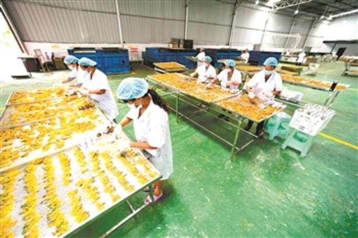 6月30日,在贵州省绥阳县小关乡金银花种植基地加工车间,村民在加工金银花。