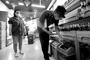 7月1日上午,北京市东城区建国门街道苏州胡同,行政执法队正在对便民超市的垃圾分类情况进行执法检查。